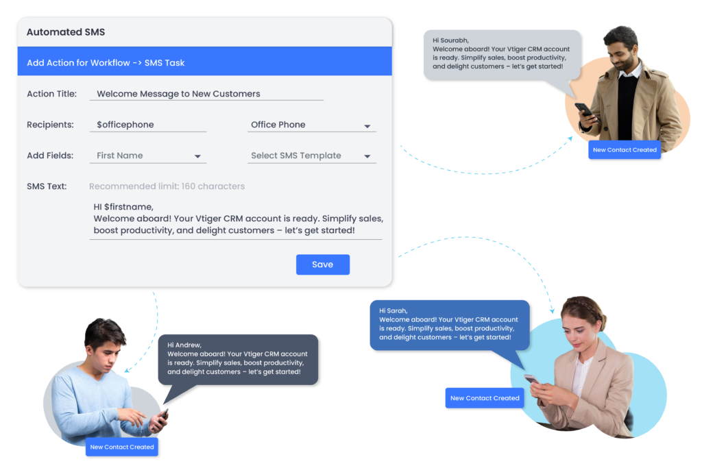 Whether it’s sending a quick update to a customer or informing them about your product launch, messages are the fastest way to communicate. And, with Vtiger’s Messages Integration, you can send messages directly without juggling between multiple applications.